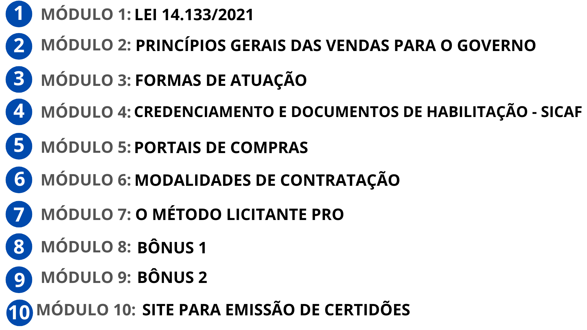 Em outras palavras: você não sai só com conhecimento, mas com tudo o que precisa para começar nas licitações de forma profissional.